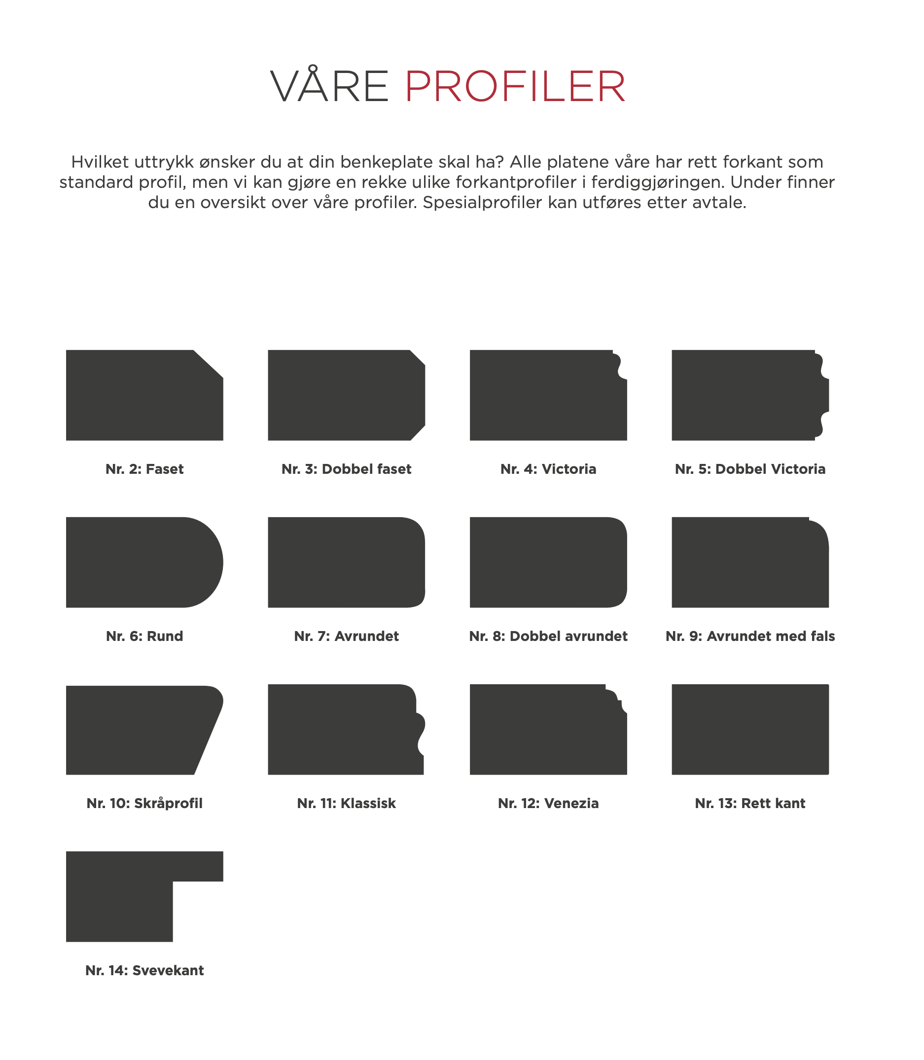 I tillegg til farge spiller også forkantprofil, vanger og sammenføyninger inn på om du ønsker en moderne eller mer klassisk benkeplate. Som prikken over i’en i den heltreplate, tilbyr vi også flere tilleggsløsninger som integrert ladeplate for mobil, eller backflip – vendbare stikkontakter skjult i platen.