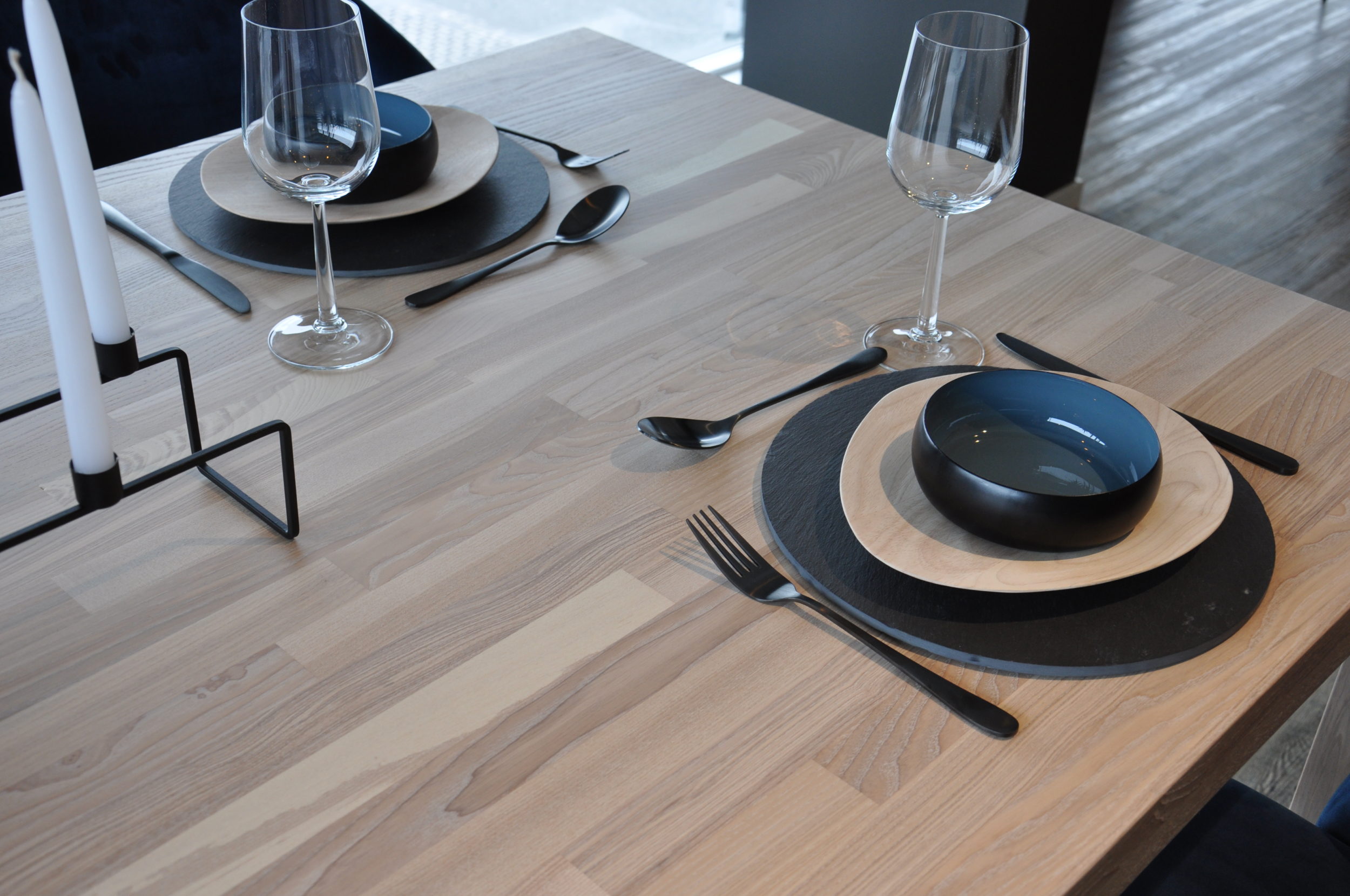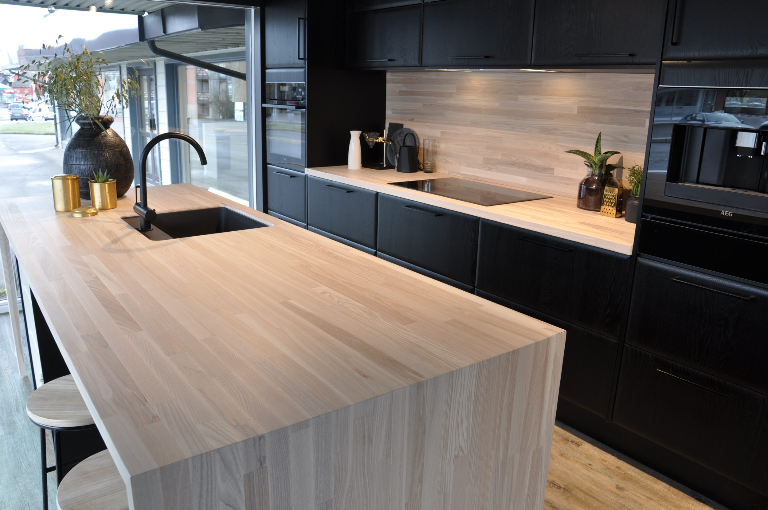 Legg merke til bakveggen, som er i samme materiale, heltre ask brunkjerne med hvit OSMO hardvoksolje. I denne kjøkkenløsningen er det også et matchende spisebord som du kan se her.